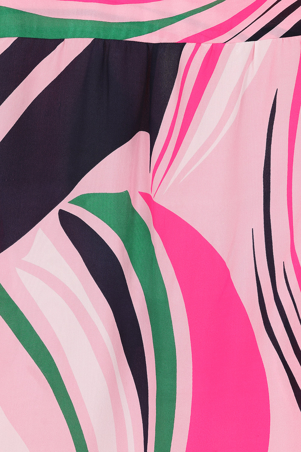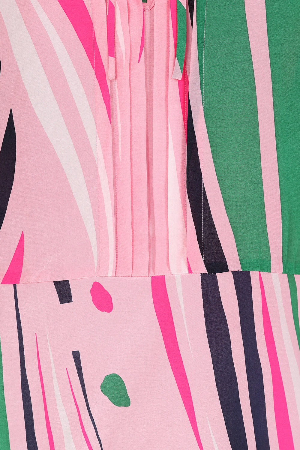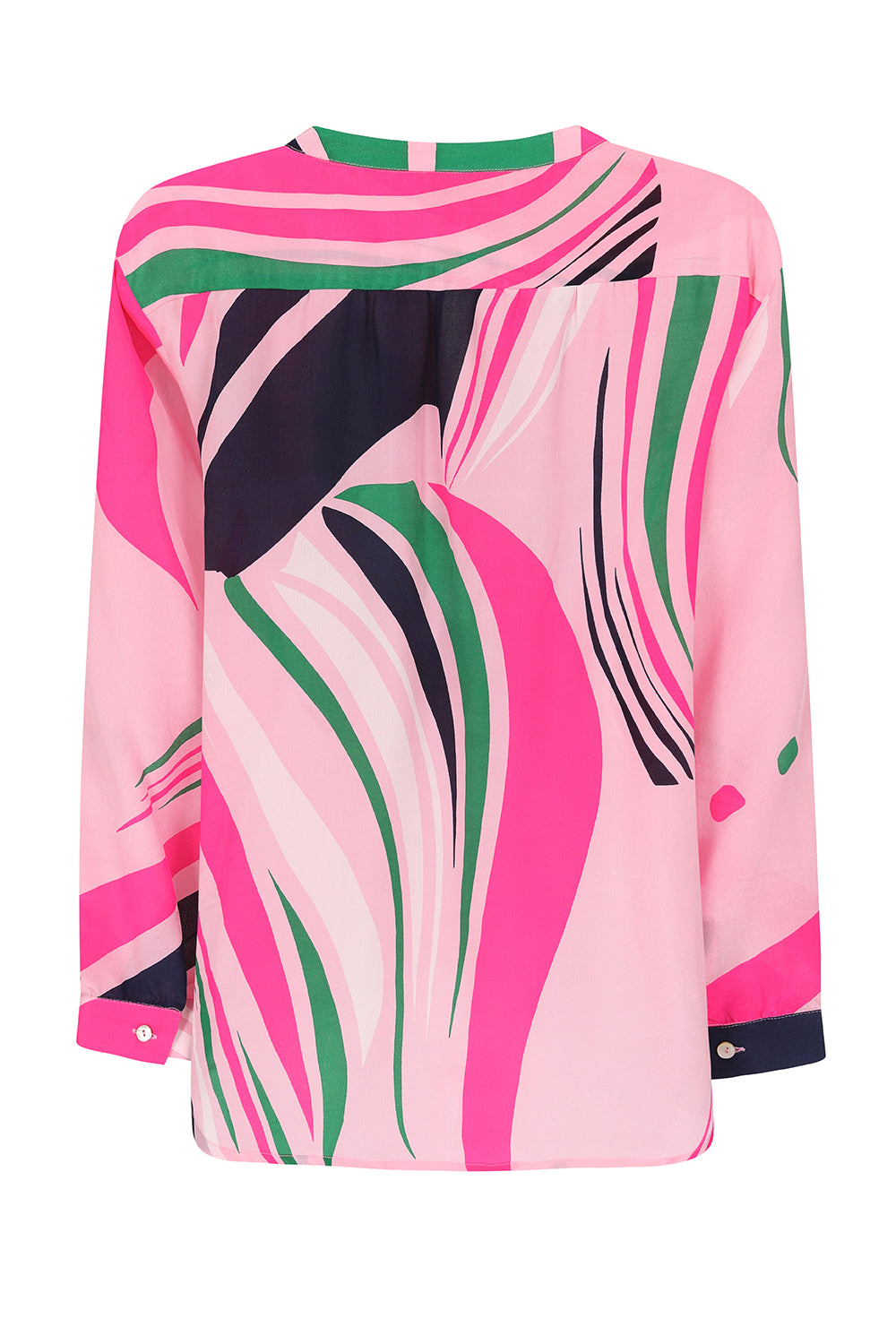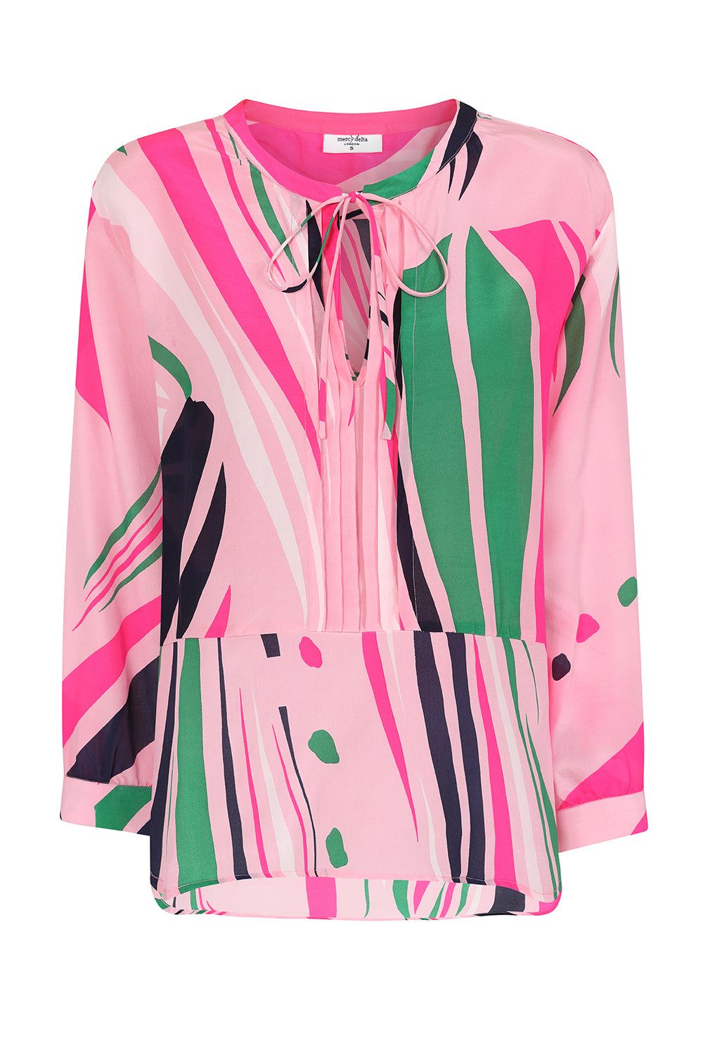 Fit details: Loose tunic body with side split vents. Round neckline with V cut out and tie fastening. Dipped hem. Buttoned cuffs.